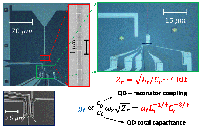 The cQED approach is also of primary importance as a means for scaling semiconductor QDs-based architecture9. We implemented a first device prototype (see Fig.4), consisting of two depletion DQDs defined in a GaAs 2DEG and separated about 45 µm13. Both DQDs are capacitively coupled to the same side of a high impedance SQUID array resonator, which mediates the coherent interaction between them. This technique provides a “copy-and-paste” scheme for adding qubits to an existing network, thus potentially mitigating the scaling problem that typically plagues platforms based on QD-based qubits.