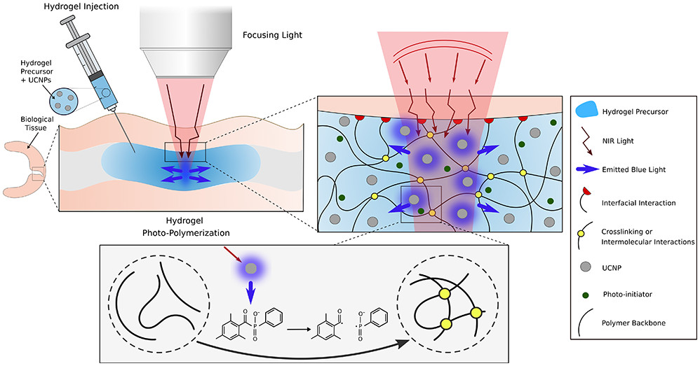 Karami P., Rana V. K., Zhang Q., Boniface A., Guo Y., Moser C., Pioletti D., NIR Light-Mediated Photocuring of Adhesive Hydrogels for Noninvasive Tissue Repair via Upconversion Optogenesis, Biomacromolecules, 23, 12, 5007–5017 (2022).