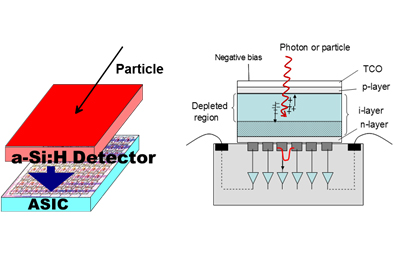 a-Si:H diode diodes can be deposited directly on top of a readout electronics to create monolithic detectors for visible light imaging or particle tracking. Array of diodes are the defined by the electronic readout pads.