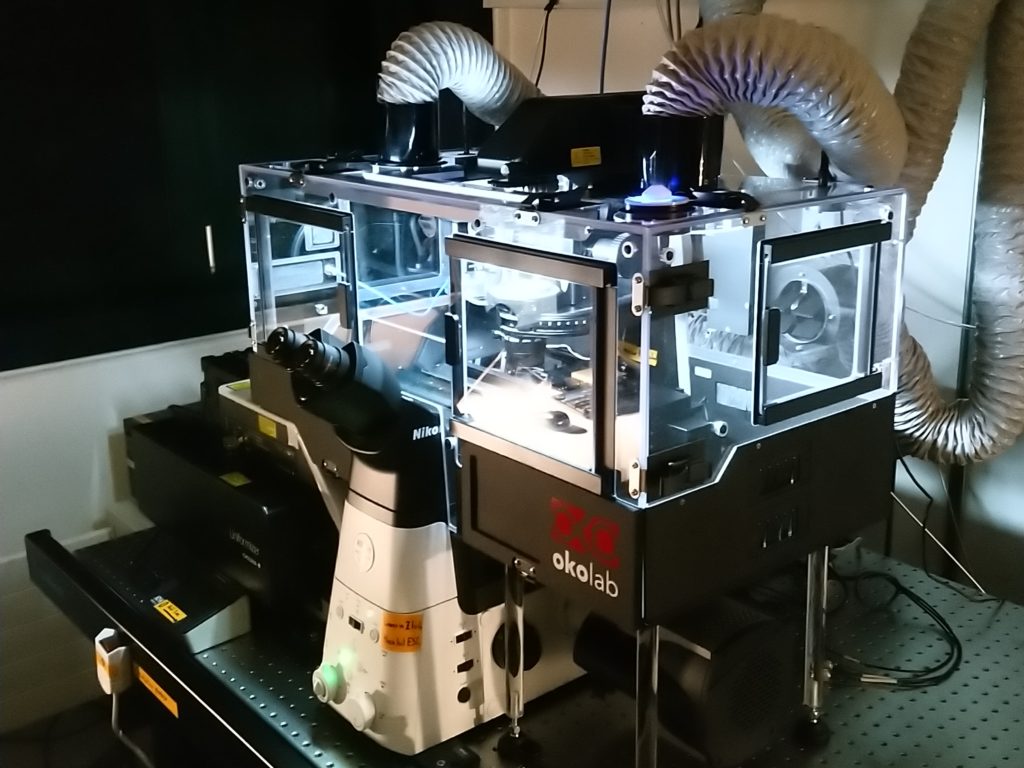Nikon Spinning Disk CSU W1. Fast confocal (dual camera) with environmental control (temperature and CO2). Includes illumination homogeneizer for large FOV acquisitions with limited vignetting, hardware autofocus (Perfect Focus System), and additional FRAP, TIRF and STORM modules.