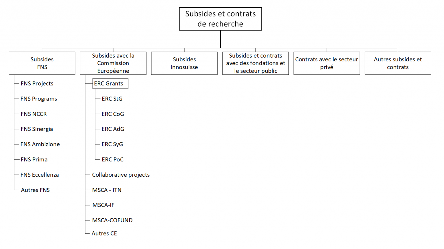 | Subside CE (FP7, H2020, Horizon Europe) | Subside de recherche établi avec la Commission Européenne (ERC + MSCA + autres) |