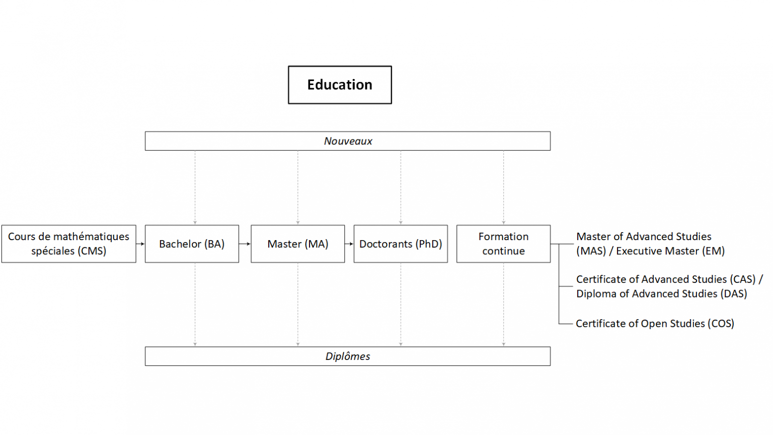 | DiplĂŽmes | DiplĂŽmes dĂ©cernĂ©s aux Ă©tudiants au cours de lâannĂ©e civile, en fonction de leur niveau dâĂ©tude. Les diplĂŽmes attribuĂ©s avant 2005 ont Ă©tĂ© remplacĂ©s par les master, alors que les diplĂŽmes bachelor nâavaient pas dâĂ©quivalent avant 2005. La formation continue dĂ©livre des masters (MAS ou EM) correspondant Ă au moins 60 crĂ©dits ECTS, des diplĂŽmes (DAS) correspondant Ă au moins 30 ECTS et des certificats (CAS) correspondant Ă au moins 10 ECTS. Les certificats dâopen studies (COS) ne sont pour lâinstant pas rĂ©pertoriĂ©s. |