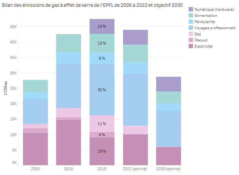 Par ailleurs, à travers son plan d’action « Voyages en avion », la Confédération encourage les actions menées pour diminuer les émissions carbone liées aux voyages en avion. L’EPFL fait sien l’objectif mentionné de diminuer de 30% les émissions de CO2 d’ici 2030 par rapport à 2019.