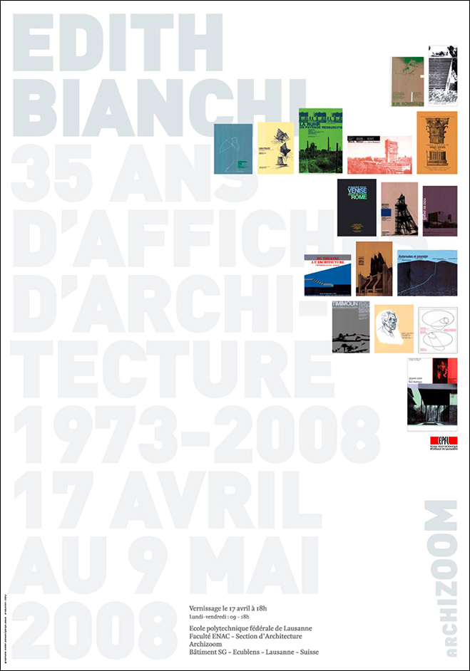 Pendant 35 ans Edith Bianchi a produit des affiches pour les manifestations du Département d’Architecture de l’Ecole Polytechnique Fédérale de Lausanne. Entre autres charges, elle était responsable de l’organisation des conférences et des expositions d’architecture par lesquelles le Département d’Architecture se manifestait publiquement.