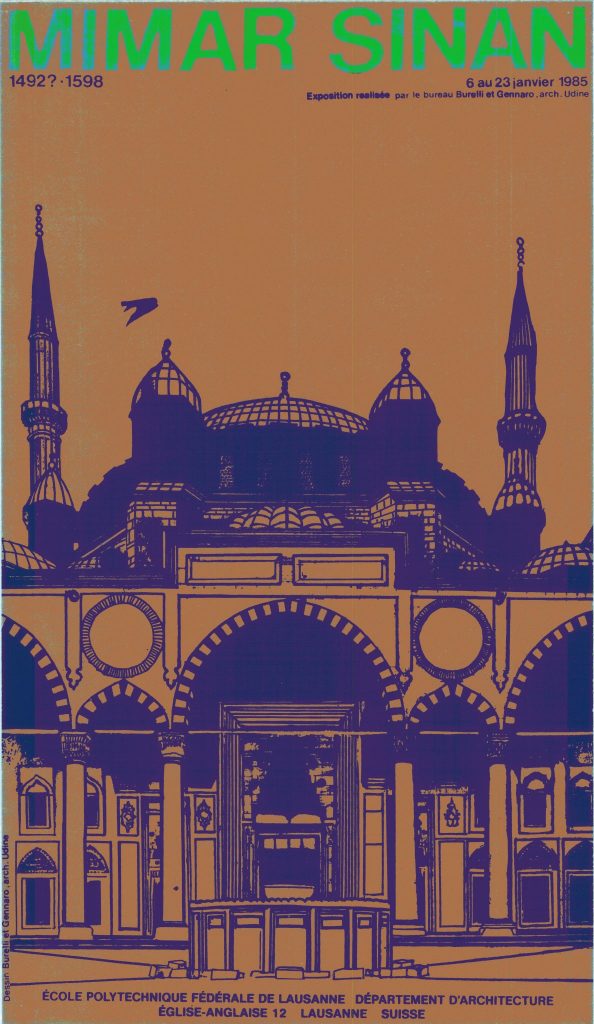 L’exposition sur Sinan entend donner raison à l’attention prépondérante de l’architecte pour la complexité et la richesse de l’édifice à plan central par rapport aux questions de style et des ordres sur lesquels furent fondées toute la la critique des XVIIIe et XIXe siècles. Cette préoccupation est à la base des dessins exposés. Le relevé effectué sur place est transcrit en dessinant les trames complexes de la composition géométrique de la construction de Sinan en procédant de la coupole au niveau d’implantation sur le terrain . Les dessins de l’exposition représentent également les éléments figuratifs, les pendentifs à stalactites, les chapiteaux, les mirhab, les arcs ogivaux, etc… mais de manière secondaire car la prépondérance est donnée à l’organisation architecturale et à la couleur.