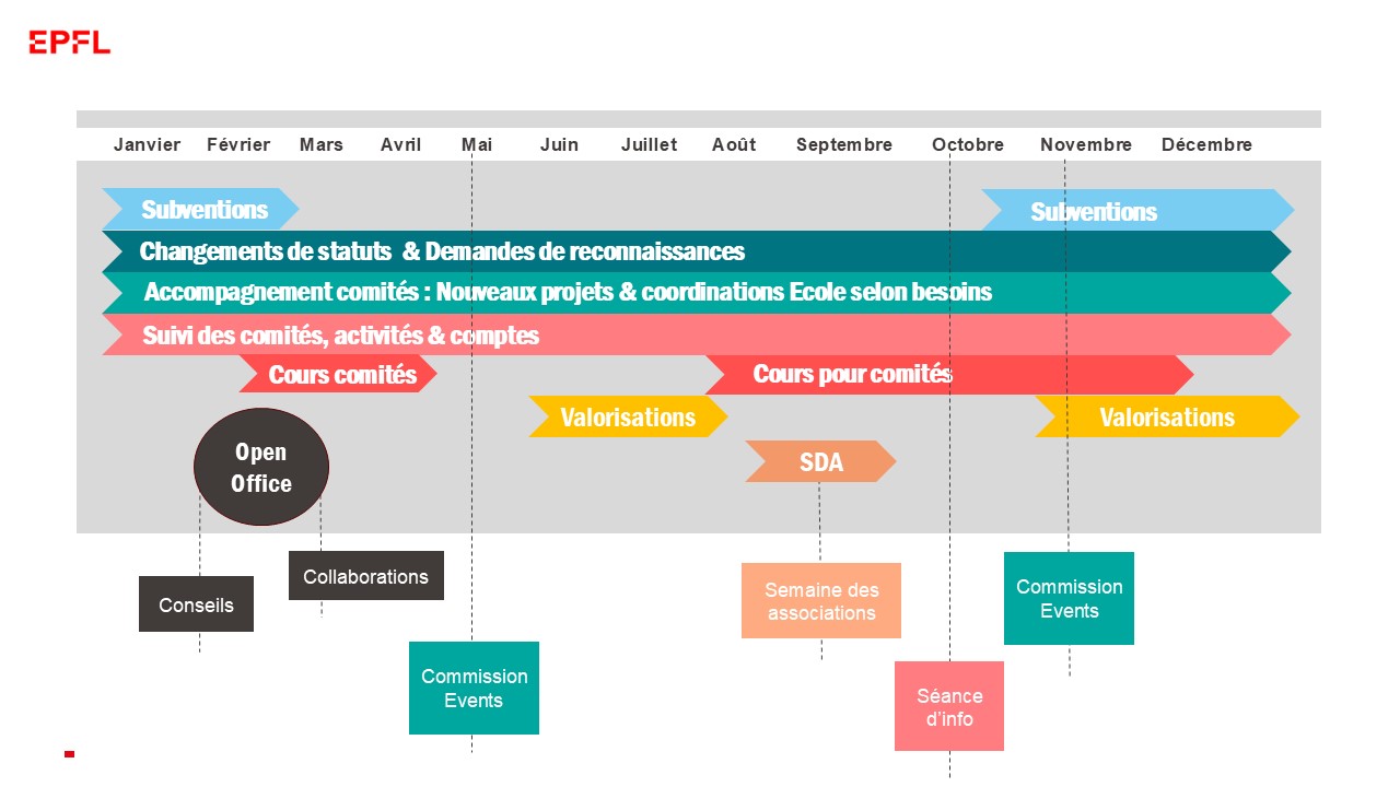 The Office of associative affairs is the EPFL’s central entity, attached to the VPA DP-RE, which oversees associative activities. Working closely with the more than 100 recognized associations and the various EPFL departments concerned, our role is to offer them the best possible framework for organizing their associative activities on campus, developing and recognizing the cross-disciplinary skills they have acquired, and integrating them into institutional events.