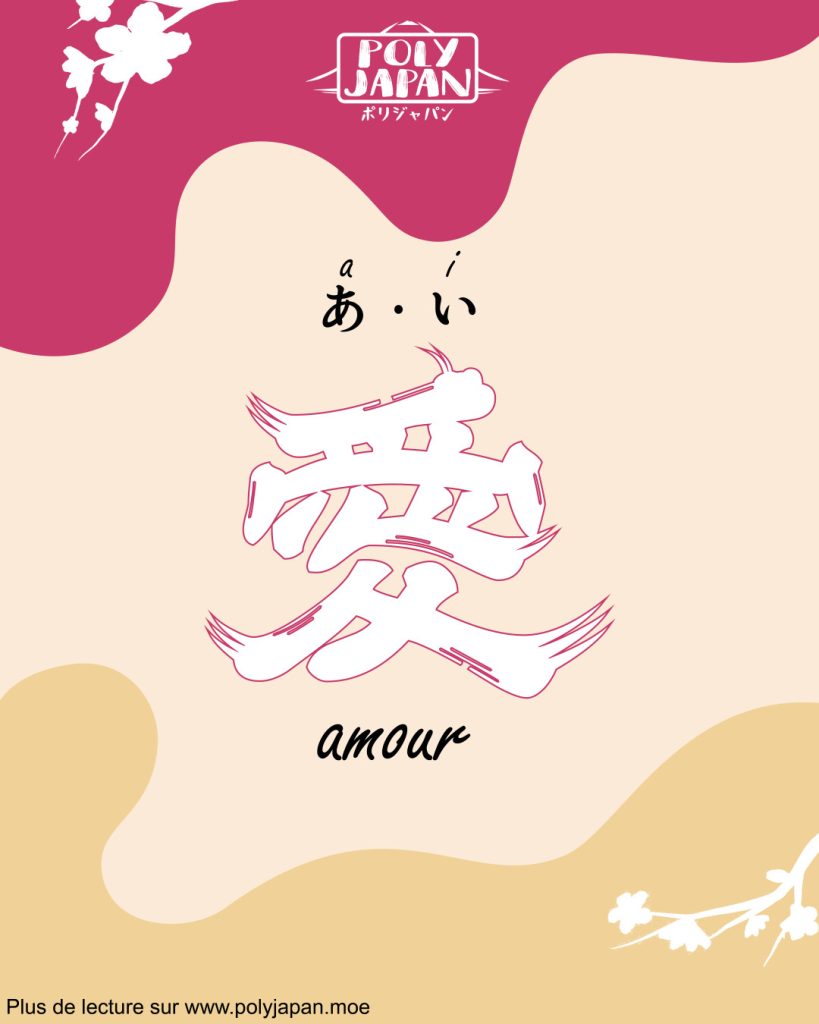On le retrouve dans 愛してる (aishiteru, je t’aime), 愛情 (aijō, tendresse), ou 恋愛 (ren’ai, relation amoureuse). Pour l’amour amical, on dit plutôt 好き (suki, je t’aime bien), et envers les parents, c’est 親孝行 (oyakōkō), qui désigne les gestes de respect et de gratitude.