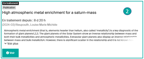 - En traitement (pending validation) (2) : la notice est en cours de validation par l’équipe Infoscience. Seule l’option Voir est proposée.
