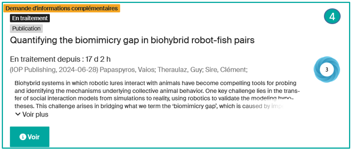- Informations complémentaires requises (Additional Information required) (4): la notice a été traitée par l’équipe Infoscience, mais renvoyée pour complément d’informations. Seule l’option Voir est proposée. Veuillez répondre au mail reçu avec les informations demandées, cela créera un ticket automatiquement. L’équipe Infoscience se chargera de mettre à jour la notice.