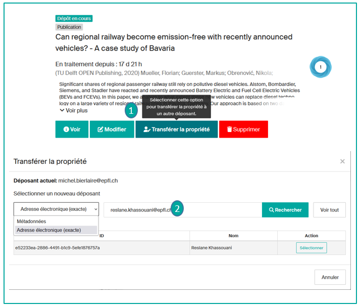 *Transférer la propriété : attribuer la responsabilité du dépôt à un autre membre EPFL. Elle sera transférée dans le Tableau de bord du nouveau déposant.