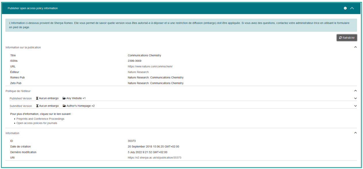 La section Sherpa Romeo “Publisher open access policy information” vous aide à choisir correctement la licence adéquat à chaque fichier.