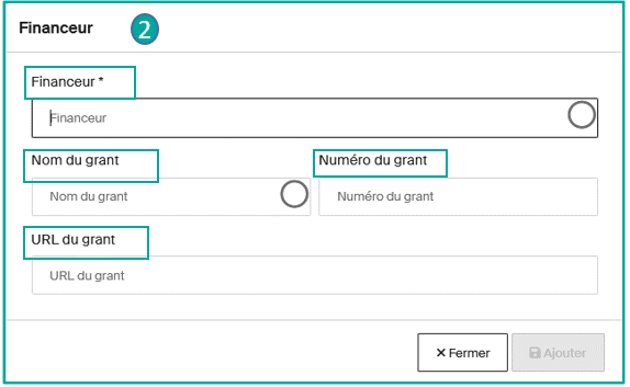 Lorsque vous ajoutez un Financeur, une fenêtre s’ouvre (2) : complétez le(s) champ(s), des aides à la saisie sont disponibles pour les financeurs (données issues de RoR) et les noms de grants (données issues d’OpenAIRE).