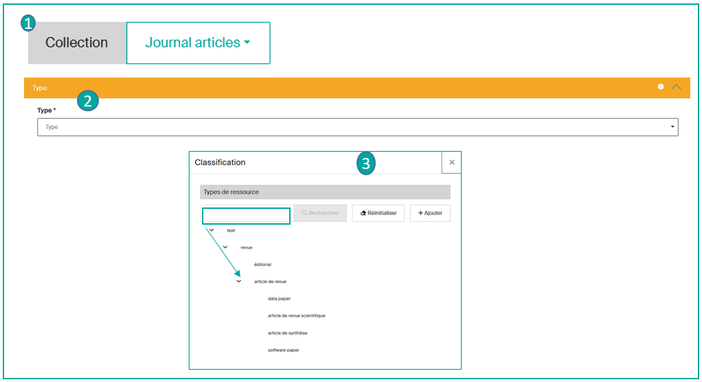 Lorsque vous effectuez un dépôt (voir page “Déposer une publication”), commencez par choisir la famille de documents pertinente (1), puis le type de document (2) adéquat.