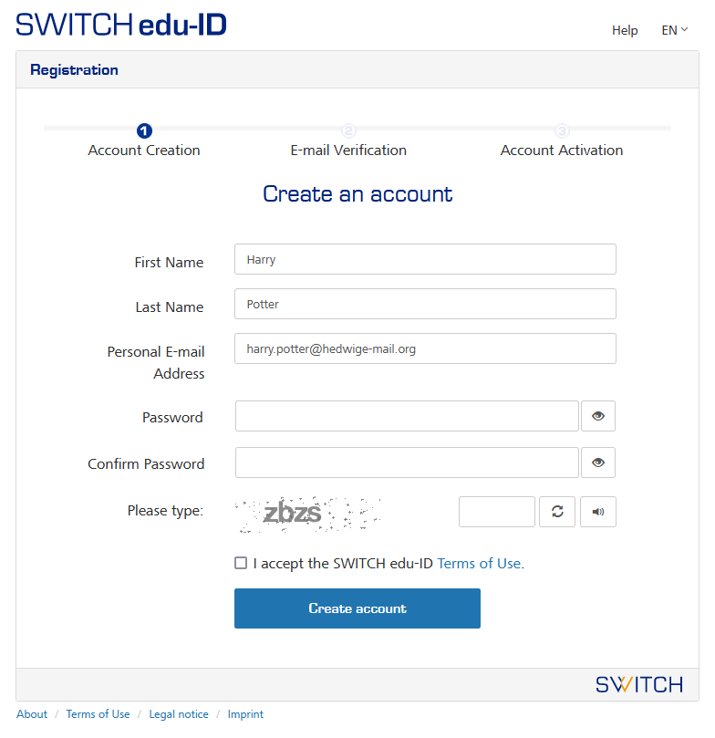 - You are redirected to the creation of your SWITCH edu-ID account. Fill in all the information requested in the form.