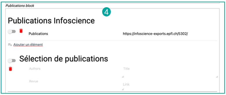 - In the right-hand column, under the block settings, in the “A direct Infoscience URL” field (3), replace the URL with the new Infoscience query (see Creating a query to populate your list).