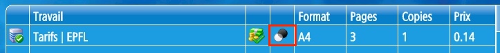 - Choisir le job (s’affiche avec le détail et le prix qui correspond à l’impression en couleur) puis Imprimer (Print)NB: si vous souhaitez le réimprimer une seconde fois dans un délai de 1h, choisir “Imprimer & Sauvegarder“; le job sera visible dans la liste des travaux imprimés
