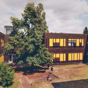 Les stores colorés apportent de la chaleur à la façade recouverte de panneaux à l’aspect rouillé. Ils permettent aussi d’orienter étudiant·e·s et enseignant·e·s à travers les différents bâtiments.