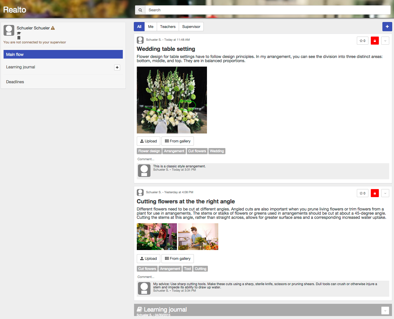 Einträge in REALTO können privat gehalten oder mit anderen Lernenden, Lehrpersonen und BerufsbildnerInnen geteilt werden. Einträge in REALTO werden in chronologischer Reihenfolge gezeigt (siehe Abbildung 3). Jeder Eintrag kann einen Titel, eine Beschreibung, Tags (Schlüsselwörter) und Kommentare beinhalten. Fotos können direkt in REALTO bearbeitet werden um wichtige Elemente hervorzuheben.