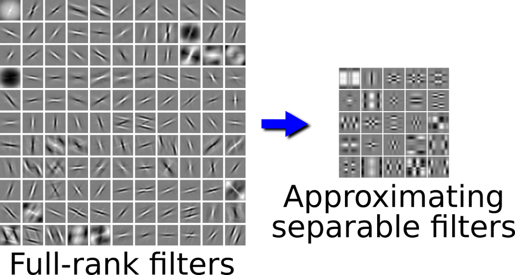- We project the learned non-separable filter bank on a learned separable basis, making the computational costs of convolutions negligible with no loss in accuracy. We do this by approximating the full-rank filters using a smaller filter basis, where we impose the nuclear norm on each element to promote its separability.