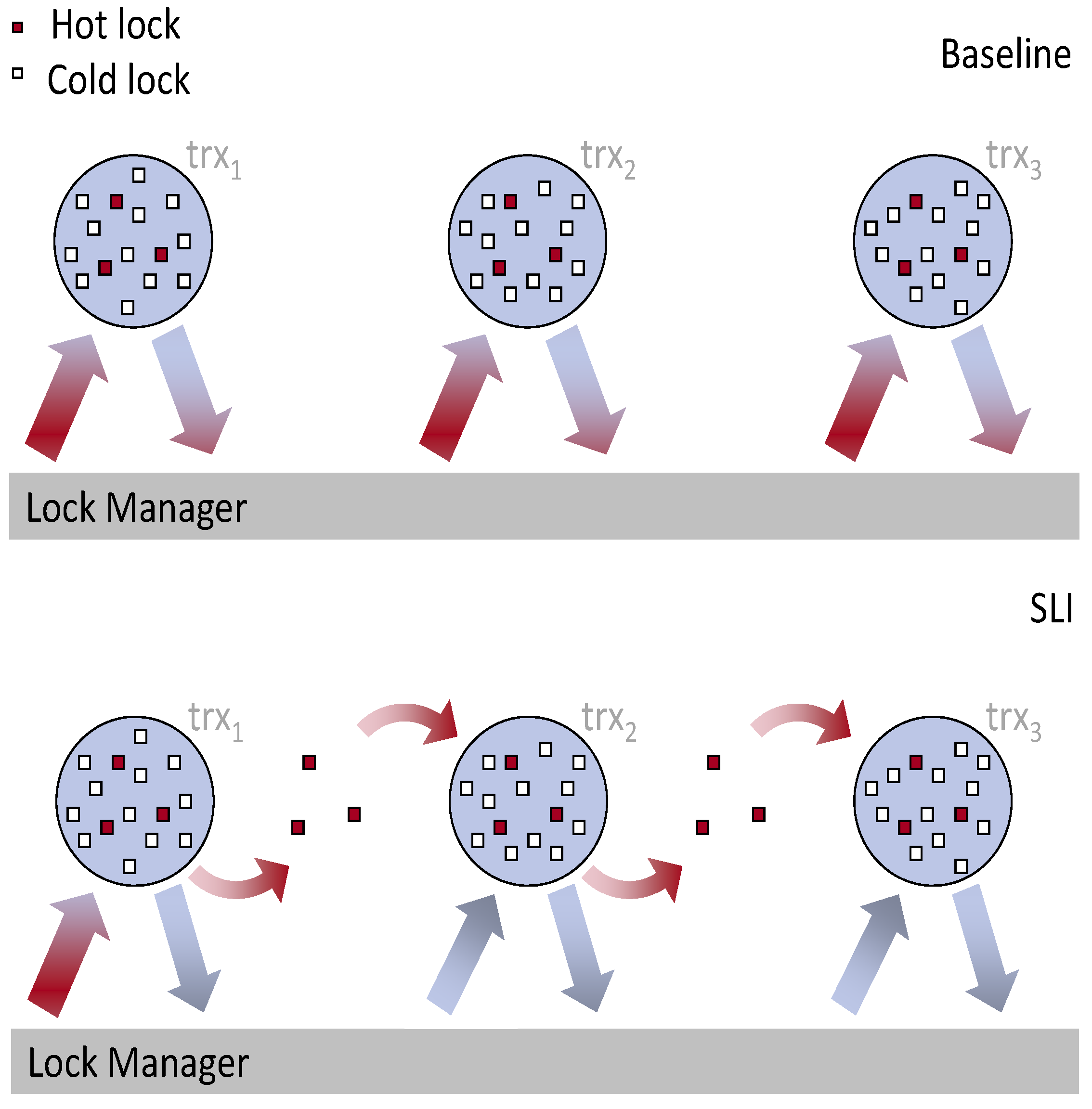 Speculative Lock Inheritance (SLI) [8]: This project highlights the negative scalability impact of database locking, an effect which is especially severe for short transactions running on highly concurrent multicore hardware. We propose and evaluate Speculative Lock Inheritance (SLI), a technique where hot database locks pass directly from transaction to transaction, bypassing the lock manager bottleneck. We implement SLI in the Shore-MT storage manager and show that lock inheritance fundamentally improves scalability by decoupling the number of simultaneous requests for popular locks from the number of threads in the system, eliminating contention within the lock manager even as core counts continue to increase. We achieve this effect with only minor changes to the lock manager and without changes to consistency or other application-visible effects.