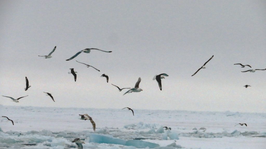 A bit further south even, life came back. Had we seen a couple of birds, a seal, one polar bear and one fox while being at the MOSAiC floe, we were now followed by swarms of birds who smelled the fumes of the ocean (dimethyl sulfide) after the ice had been broken by Polarstern. Also, microbiology was visibly active along the way, tainting the ice green and brown.