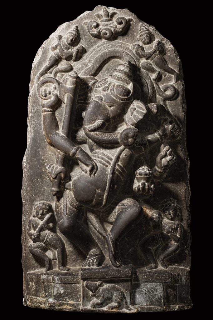 Ganesha (Niritya-Ganapati), in five of his hands, he holds the angulia (upper right), Kuthara (lower right), the coil serpent (upper left), the rubypot with modakas (lower left) and the danta (middle left); while the sixth hand is shown as hanging freely to accentuate the dancing posture. His belly is girdled by a serpent, while the sacred thread, which is also in the form of a serpent, hangs from over his left shoulder. He is wearing a three-tiered crown-like headdress, above are two flying Gandharvas carrying garlands. Two attendants are in a dancing posture with musical instruments, and the lyre and Khanjura are shown on the pedestal on either side of Ganesha. The mouse, the vehicle of Genesha, appears in a niche of the pedestal.