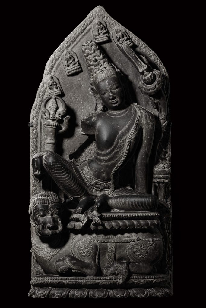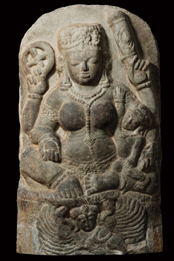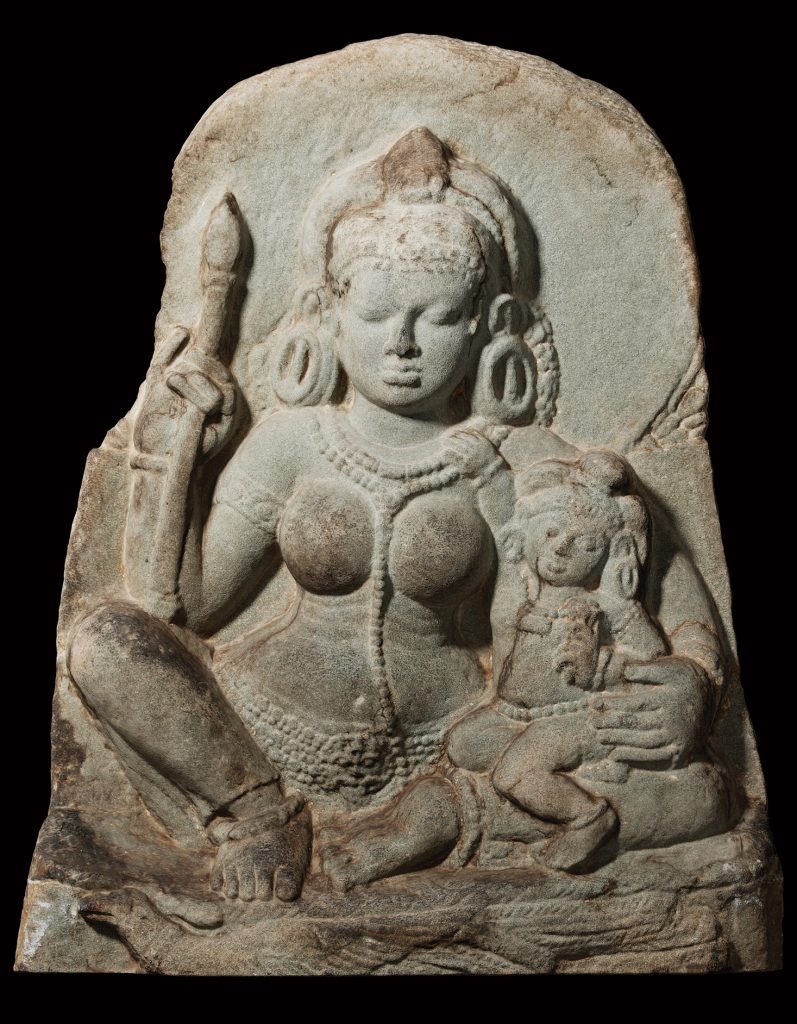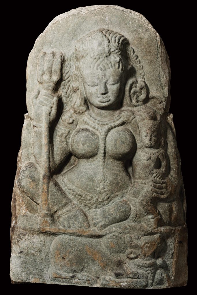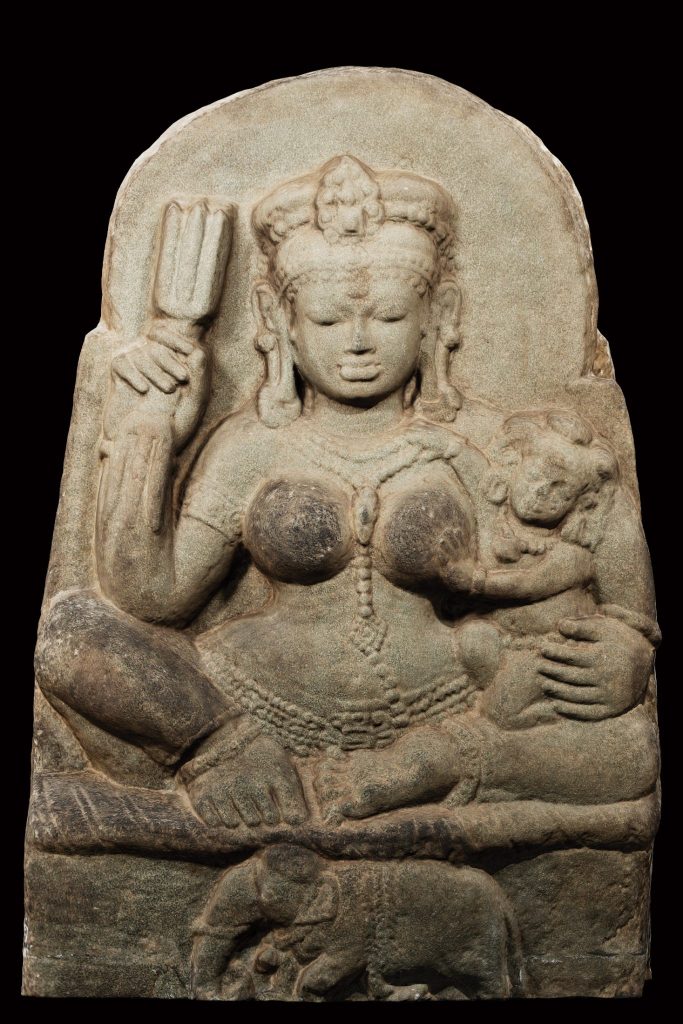 This sculpture represents Brahmani, primarily known as the consort of Brahma, the creator god. She represents the feminine aspect of Brahma’s power, she is the goddess of creation who facilitates creation, order, and cosmic harmony, just as Brahma’s role is to create the universe. She is a symbol of the creative energy that flows through all aspects of life, and she plays an integral role in the act of creation. The rosary held in her hand identifies this sculpture symbolizing meditation and spiritual wisdom. Brahmani is one of the Sapta Matrikas or the seven divine mothers, representing the saktis, or the energies of the important familiar deities are Brahmani (Saraswati) Mahesvari (Raudani) Kaumari (Karttikeyani) Vaishnavi (Lakshmi) Varahi, Indrani and Chamunda (Chamundi)—each with protective and at times destructive qualities.