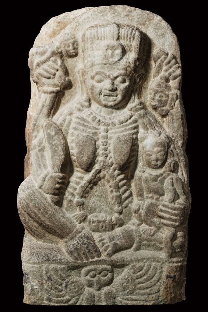 This sculpture depicts Chamunda, one of the Sapta Matrikas, the seven divine mother goddesses in Hindu tradition. Fierce and powerful, she embodies the energy of Goddess Chandi and shares attributes with Kali, also known as Chamundi or Charchika. Chamunda is portrayed with four arms, holding a sword and a skull (Kapala), symbolizing destruction and transformation. Her emaciated body, hollow belly, and grinning, terrifying face, adorned with a garland of skulls, reflect her fearsome aspect. She rides an owl, and her banner bears an eagle emblem. This showcasing the dramatic intensity and artistic mastery of early Hindu sculpture. Chamunda is one of Sapta Matrikas or the seven divine mothers, representing the saktis, or the energies of the important familiar deities are Brahmani (Saraswati) Mahesvari (Raudani) Kaumari (Karttikeyani) Vaishnavi (Lakshmi) Varahi, Indrani and Chamunda (Chamundi) —each with protective and at times destructive qualities.