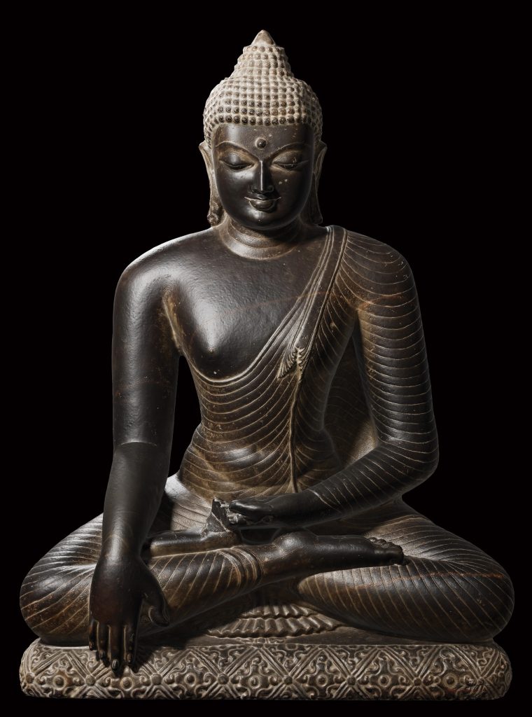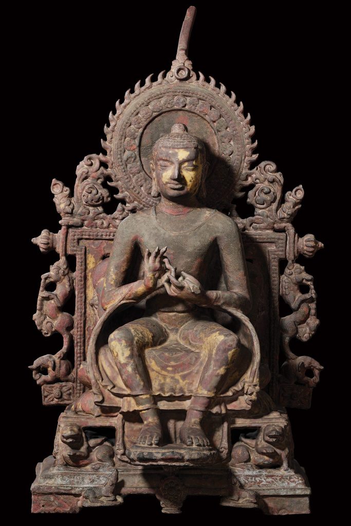 This sculpture is a small bronze and a very portable object. It is superior in its casting shows a trace of amalgam gold patina. The feet are in the royal pose. Buddha is seated on a throne with the knees slightly apart. This style of seated Buddha can also be found on occasion in Cambodia and Vietnam. His hands are in the dhamachakramudra – the preaching of the law of the Buddha or turning of the wheel of law. By the 7th century more portable works in bronze were being made and these travelled along the maritime silk route and influenced the iconography of Southeast and East Asia.