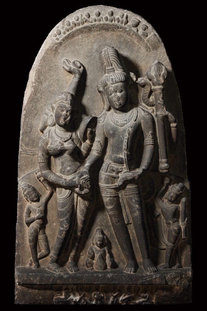 Kalyansundar is a Tamil word that means ”auspicious marriage”. It symbolically depicts the marriage of Lord Shiva and Goddess Parvati and is crafted from black stone. The image of Panigrahan (Accepting the Hand) has been engraved, where the groom (Shiva), is affirming the bride in his right hand (Parvati). Parvati is standing on the left side of Shiva, and her left hand has a mirror, and the second right hand of Shiva is lifted closely to Parvati’s head with a flat and spherical object (a mirror) in her palm. His other right-hand holds Trishula with Naga Deva, which is depicted near the Trishula. Trimukhi Brahma sits in the role of a priest between Shiva and Parvati, with the holy fire blazing in front of him. On Pedestal, the lions, dancers and musicians are depicted in low relief. In the upper part of the sculpture, the Navagraha has been engraved as a witness to marriage.