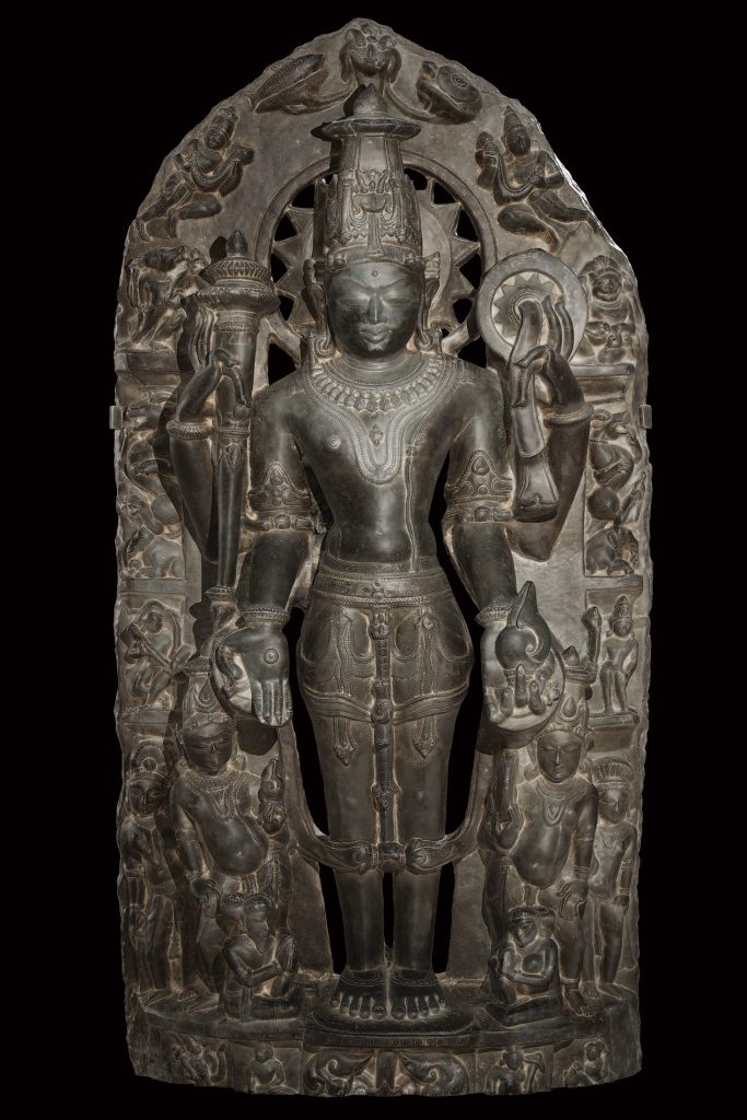 This exquisite Vishnu sculpture from the Pala period embodies divine grace and artistic mastery. Standing in perfect symmetry (samapada), Vishnu holds his four iconic attributes: the lotus (purity), conch (creation), discus (destruction of evil), and mace (power). A floral garland (vanamala) cascades elegantly to his knees, while the intricately carved stella features protective lions, celestial beings, and a fierce kirtimukha. Vishnu’s Dasavatara (ten incarnations) adorn the piece, reinforcing his cosmic role. This sculpture showcases the Pala artisans’ exceptional craftsmanship and devotion, blending spiritual symbolism with artistic excellence