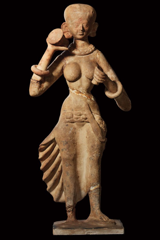 This sandstone sculpture of a Yakshini was found at Didarganj, Bihar and is considered too be one of the most famous examples of early Indian sculpture dated to around the Maurya period c. 3rd century BCE. The Yakshini is depicted as a standing female figure holding a chauri (a flywhisk), a symbol of royalty and divinity in ancient Indian art. Estimated to be more than 2,300 years old, it was found on the banks of the Ganges over a century ago. The sculpture is believed to represent a Yakshini, a type of female spirit or goddess associated with fertility, abundance, and protection in ancient Indian belief systems. The statue showcases the grace and fluidity typical of Mauryan sculpture, with soft drapery on the lower half of the body that enhances its naturalistic quality. The body of the figure is curved, a characteristic of the tribhanga posture, which was prevalent in Indian sculpture and denotes a sense of elegance and balance. The Yakshi, depicted holding a chauri, or fly-whisk in her hand, embodies the ultimate feminine beauty of pre-modern India. Her figure is voluptuous with a full bust, slender at the waist and wide at the hips. Perhaps, what is also striking about the statue is the endearing grace of her posture and demeanour. The Yakshi stoops slightly forward instead of standing upright, seeking a posture of humility. The smile on her lips is elusive, yet hauntingly sweet.