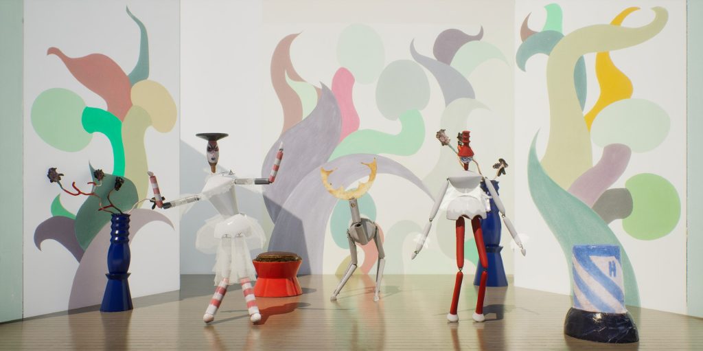 Triadic Triptych is a generative AI animation that reinterprets the abstract costumes of Oskar Schlemmer’s ‘The Triadic Ballet’ as a contemporary digital performance. Premiered in 1922 at the State Theatre of Württemberg, Stuttgart, the ballet was a symphonic dance of “threeness,” divided into three sections, performed by three dancers in twelve distinct dances, progressing from the playful to the solemn. In Schlemmer’s work, costumes dictated movement, transforming dancers into sculptural, ambulant architectures. Trained on the ballet’s historical costume designs, Triadic Triptych reimagines its iconic geometric and brightly colored forms, generating ever-evolving digital sculptures that shift and reshape while retaining the distinct aesthetic of the original.