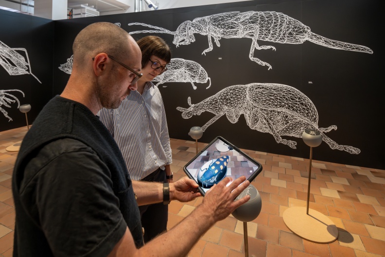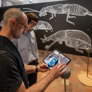 Sophisticated Geometries is a vivid confrontation with the striking creativity of nature’s architecture. Insects are among nature’s most delicate, colorful and intricate creations, but their tiny size means their splendour goes unnoticed by most of us. We invite you to explore them in a new way. As you enter, look at the tiny specimens of 12 Swiss insects on the other side of this wall, some of them well-known, others endangered or rarely observed. Take an iPad and explore the mesmerizing complexity of their digital avatars in an augmented reality realm in astonishing detail. They are derived from 3D digital scans of the real specimens, merging the organic with the digital.