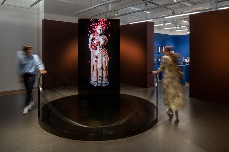 Double Truth II is an interactive installation that explores how today’s technologies unite to replicate cultural artefacts with remarkable fidelity. Showcasing a series of sacred objects from the Bihar Museum collections—spanning Jain, Hindu, and Buddhist traditions—the installation focuses on affirming and activating visitors’ sensory experiences. A human-scale viewing platform serves as a conduit for experiencing both form and formlessness: rotating the platform clockwise renders the objects as solid, photoreal facsimiles, while rotating it in the opposite direction transform the material world of the object. The 3D models in Double Truth II are technologically empowered to offer forensic insights into invisible dimensions, generating unforeseen hypotheses, connections, and materialities.