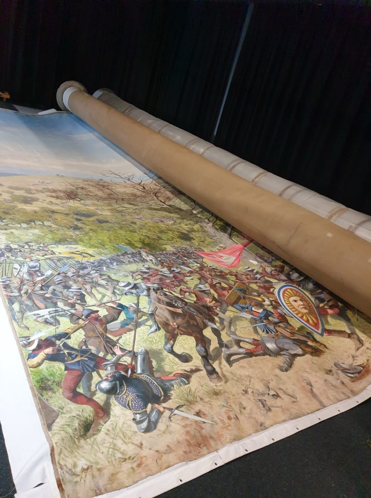 For a brief history of the painting, it was painted during 1893-1894 by a team of painters lead by Louis Braun. It depicts the battle between the Swiss Confederates and their allies against the army of the Duke of Burgundy in 1476. It was first exhibited between 1894 and 1909 in custom designed rotunda style buildings in Geneva and Zurich. In 1924 it was put into storage where it stayed until a restoration process was conducted, starting in 1996. The painting was briefly put on display at the 2002 Swiss national exposition, located in a cubic structure on Lake Geneva. Following the exposition the painting was put back into storage within a Swiss mountain facility where it has stayed until 2022 when this digitisation project started. For more information on the history and subject matter of the painting the reader is referred to documentation supplied by the “Foundation [2] for the Panorama of the Battle of Murten”.
