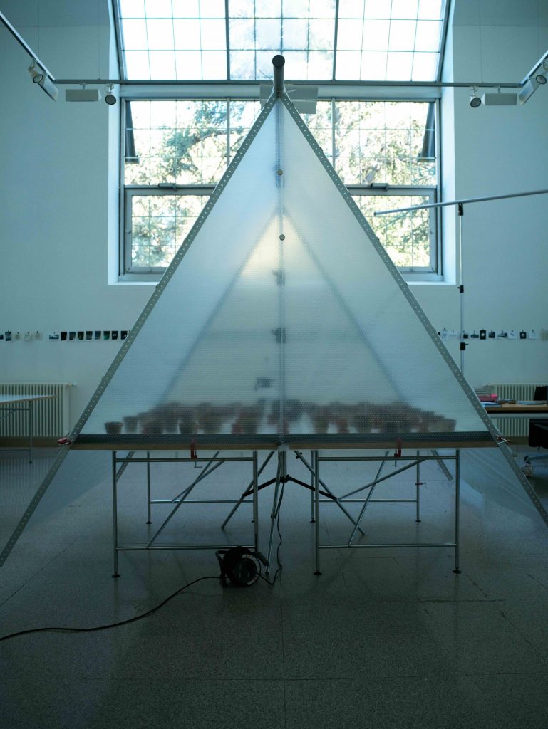 The project has been a collective weaving process by several migrants using their inherited knowledge and techniques. The steel structure has been reused from Turba Tol – Hol Hol Tol, the Chilean pavilion presented at the 59th Venice Art Biennale. Artist Johanna Unzueta and Michelle Gravel collaborated on weaving the path for the plants to grow with waxed cotton thread manufactured in Umbria. In dialogue with Erika Mayr, Michelle Gravel, and Alfredo Thiermann grew 63 Cobaea Scandens plants from their seed in their studio during their residency at Villa Massimo, carefully studying and documenting both the growth of the plants and its entangled natural, cultural, and political history.