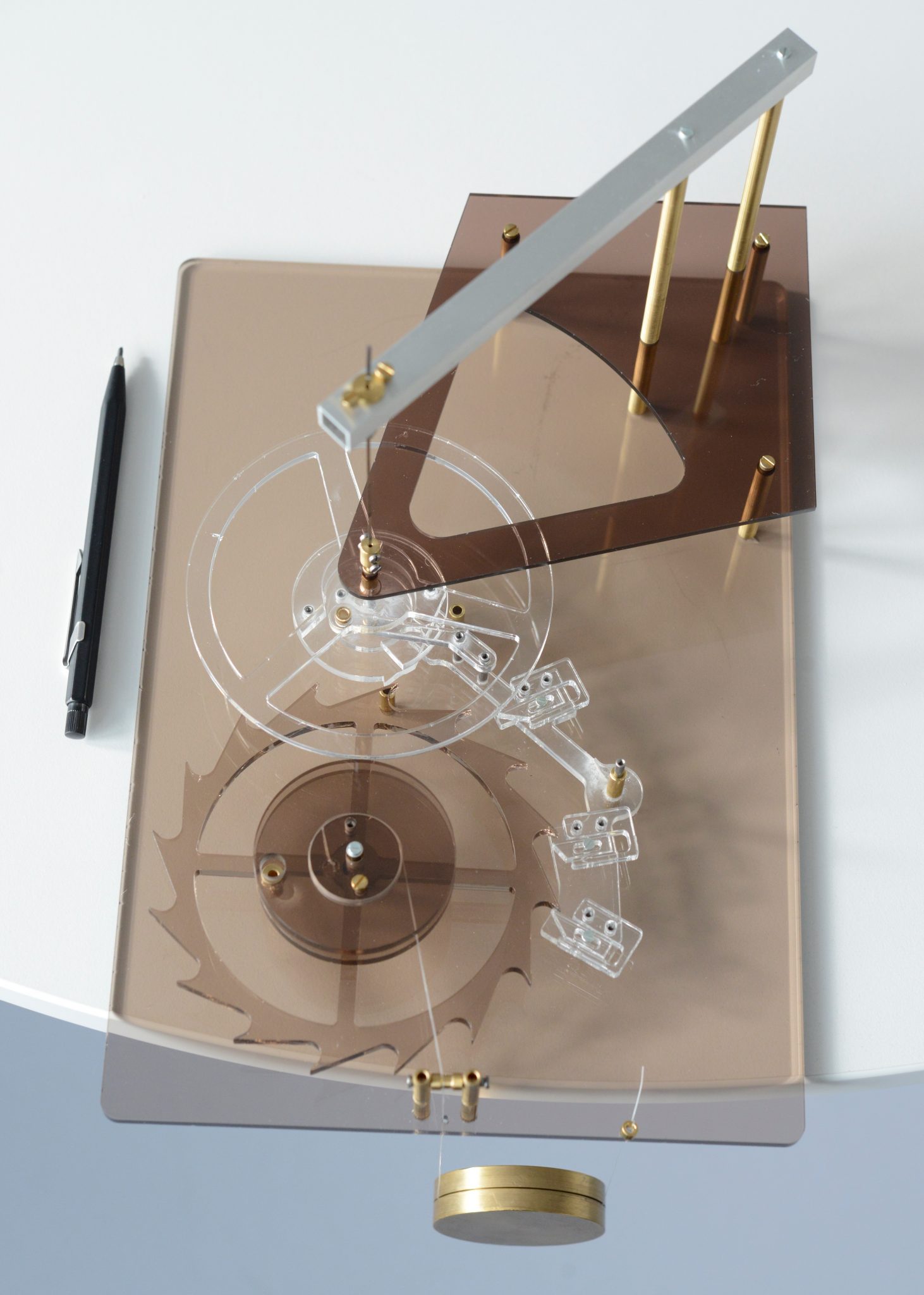Cette horloge mécanique est équipée d’un oscillateur unidirectionnel IsoSpring constitué d’une sphère suspendue par quatre tiges flexibles qui pivote sur elle-même à la manière d’un oeil dont la pupille décrirait des orbites continues: l’horloge ainsi dénuée d’échappement fonctionne sans le fameux “tic-tac” et l’aiguille des secondes avance de manière continue, tout comme les astres dans le ciel. Cette invention ouvre la porte à des améliorations considérables des performances en termes de précision chronométrique et de rendement.