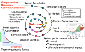 Process systems design for efficient energy conversion systems. Computer-aided methods for selecting equipments, defining their size and the optimal operating conditions and process configurations.