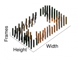 We use Achanta et al.’s method [1] to compute the supervoxels of every video shot. We select a spatial size for supervoxels by assuming that the minimum size for an object of interest is equal to 20 pixels. We choose the longest possible temporal size to capture the motion of an object throughout the video shot. We can see an example of supervoxel extraction in Figure 2. We represent each supervoxel with their average color (averaged in L*a*b* space) in Figure 2(b).