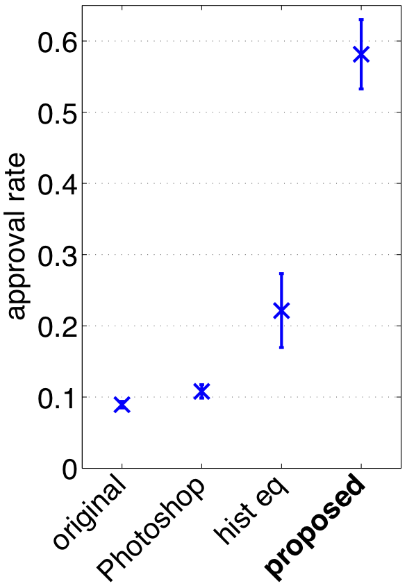 Results from two psychophysical experiments. Left: Approval rates from 30 observers for different S values. Images of all except one semantic concepts are enhanced with success rates of up to 93%. The approval rate for light jumped to 62% in an additional experiment where we invited only artists. Right: Approval rate from 40 observers comparing the proposed method against other contrast enhancement methods (histogram equalization and Photoshop's auto contrast function). The proposed method scores more than 2.5 times better than the 2nd best. The error bars in both figures show the variances across different images.