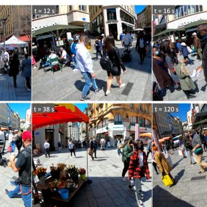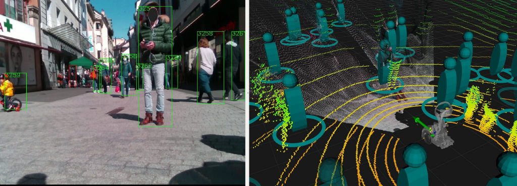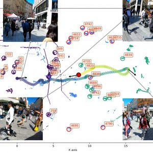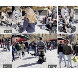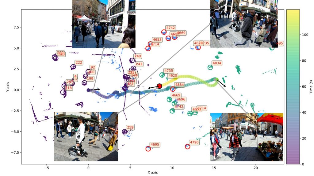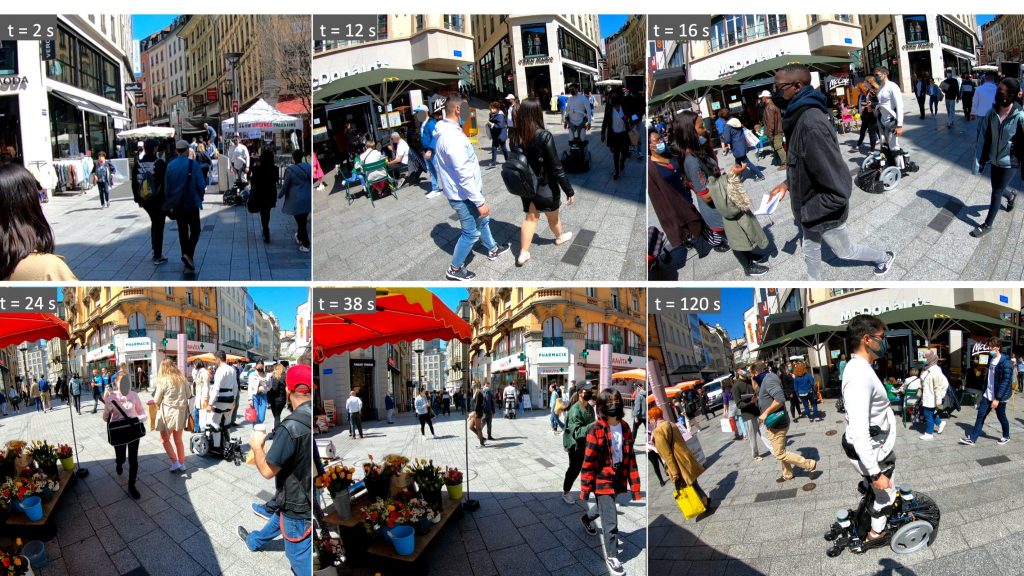 The current dataset – crowdbot – presents outdoor pedestrian tracking from onboard sensors on a personal mobility robot navigating in crowds. The robot Qolo [1,2], a personal mobility vehicle for people with lower-body impairments was equipped with a reactive navigation control operating in shared-control [3,6] or autonomous mode [4,5] when navigating on three different streets of the city of Lausanne, Switzerland during farmer’s market days and Christmas market. Full Dataset here: DOI:10.21227/ak77-d722