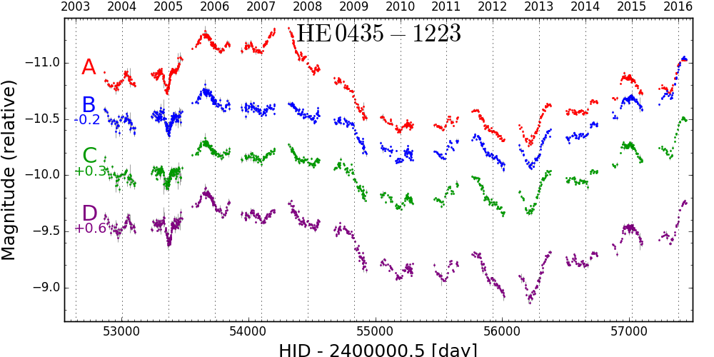 The COSMOGRAIL project is now running for more than 13 years. It monitors dozens of lensed quasars with small scale telescopes all around the world, including the 1.2m Swiss Leonard Euler telescope located a few hundred meters away from the 2.2m MPG telescope, in La Silla. The most recent, and perhaps most impacting result of this project is a 2.4% determination of the Hubble constant, using the light curves of the lensed QSO HE0435-1223 presented in the figure below.
