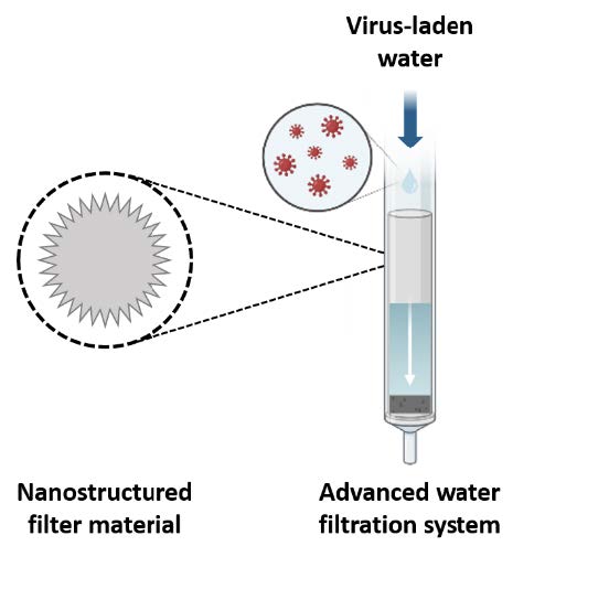 Human activities and climate change are increasing the contamination risk posed by water-borne viruses to global water systems1. Conventional approaches for viral filtration from water, such as disinfection (e.g. via chlorination), often require centralized infrastructure with expert monitoring2. Unfortunately, these technical strategies are often inaccessible to underdeveloped or remote communities, and lack the flexibility to deal with emergencies such as natural disasters3. In these instances, simplified approaches such as gravity-based depth filtration are better suited to obtain clean drinking water4.