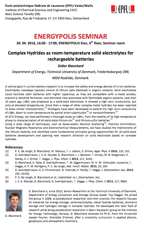 10. Mai 2021 Seminar talk, EPFL Valais/Wallis 11:00 – 12:00 EPFL Valais/Wallis ZOOM Dr. Guillaume BRAESCH “High performance direct borohydride fuel cell using non-PGM electrocatalysts” LEPMI, Grenoble-INP |