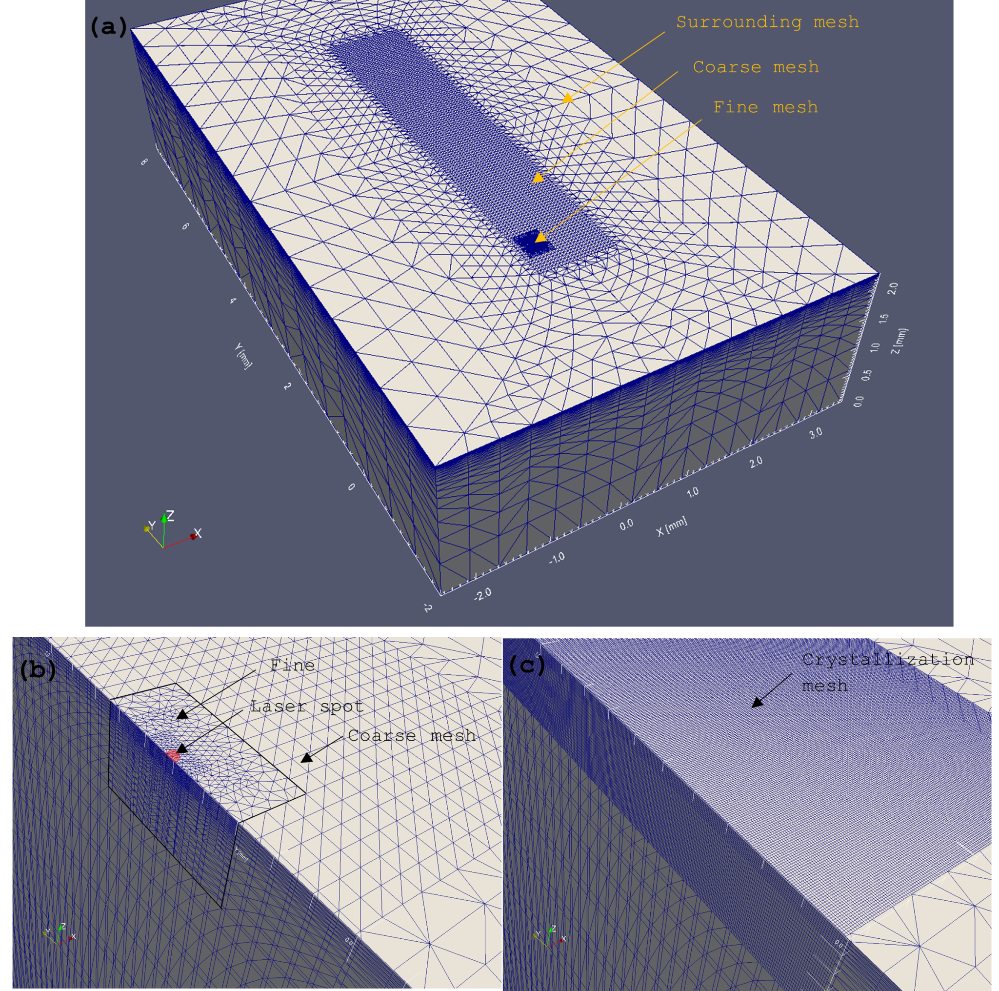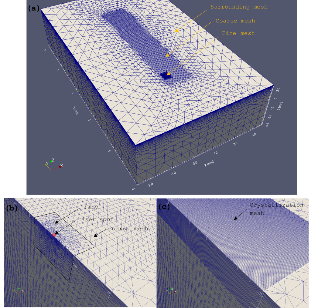 The mesh consists of a fixed coarse mesh on the whole domain and a refined moving mesh around the laser spot to get the needed accuracy for the computation of thermal conduction within the powder and at the interface between the powder and the bulk solid or liquid.