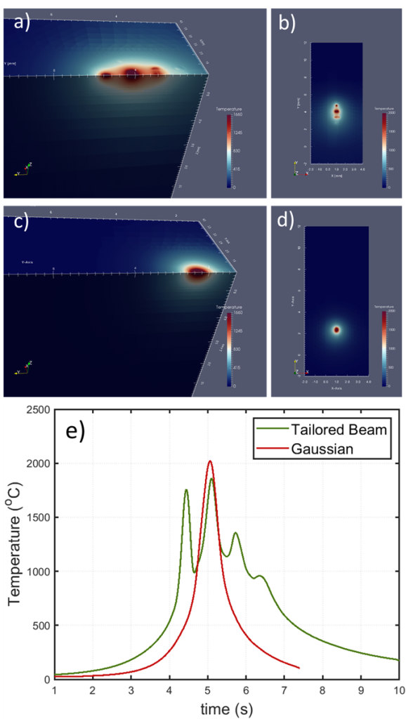 The laser beam is modelled as a surface heat source for bulk and liquid and a volume heat source for powders. The powder bed is considered as a homogeneous medium with averaged (so-called effective) properties such as absorptivity, thermal conductivity, optical penetration depth, density.