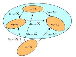 Fig. 2. Simple illustration of a groupoid structure with 2D example. The parent square is in orientation relationship with the daughter triangles. As the number of common symmetries is 2 (identity and mirror symmetry mx), the number of variants is 8 (number of symmetries of a square) divided by 2 = 4. There are 3 operators (identity O0, rotation by a quarter turn O1, inversion O2). Their composition is mutivalued if the variants that form the operators are not considered. It becomes monovalued when a variant (here variant 1) is taken as a reference.