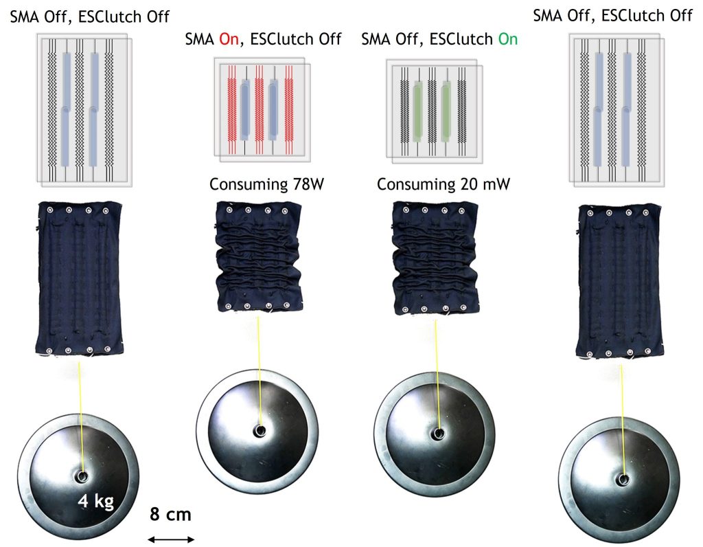 Imagine wearing clothes that can help you lift heavy boxes, support your arms, or assist with other daily activities — all without bulky motors or large batteries constantly draining. Researchers at EPFL soft transducers lab developed a fabric actuator (called SEFA, see our article in Advanced Functional Materials, by Huapeng Zhang et al), which is smaller than A4 paper, as lightweight as an egg. SEFA can lift several kilogram weight using the integrated SMAs, but consumes nearly zero electric power to holding this weight in a given position, thanks to electrostatic clutches.