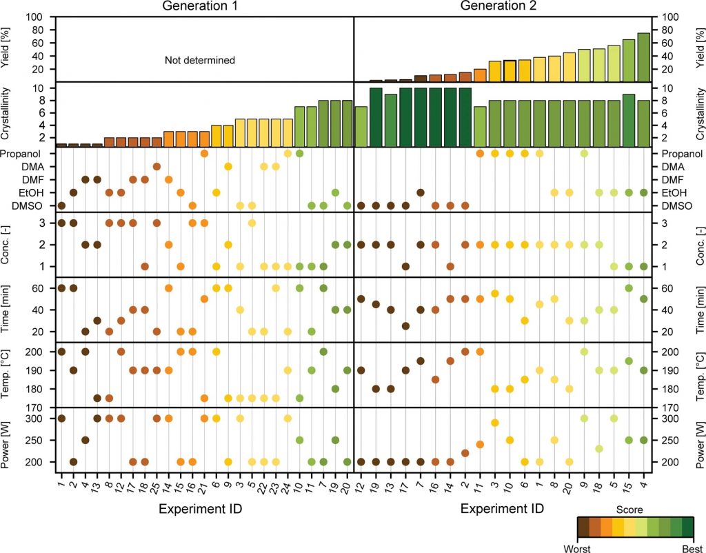 Abstract: The synthesis of metal-organic frameworks (MOFs) is often complex and the desired structure is not always obtained. In this work, we report a methodology that uses a joint machine learning and experimental approach to optimize the synthesis conditions of Al-PMOF (Al2(OH)2TCPP) [H2TCPP = meso-tetra(4-carboxyphenyl)porphine], a promising material for carbon capture applications. Al-PMOF was previously synthesized using a hydrothermal reaction, which gave a low throughput yield due to its relatively long reaction time (16 hours). Here, we use a genetic algorithm to carry out a systematic search for the optimal synthesis conditions and a microwave-based high-throughput robotic platform for the syntheses. We show that, in just two generations, we could obtain excellent crystallinity and yield close to 80% in a much shorter reaction time (50 minutes). Moreover, by analyzing the failed and partially successful experiments, we could identify the most important experimental variables that determine the crystallinity and yield.